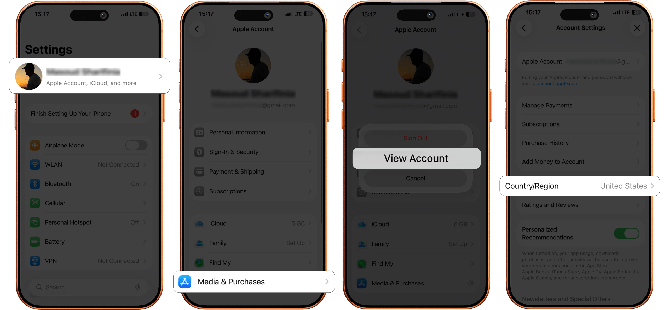 Settings → Name → Media & Purchases → View Account → Country/Region
